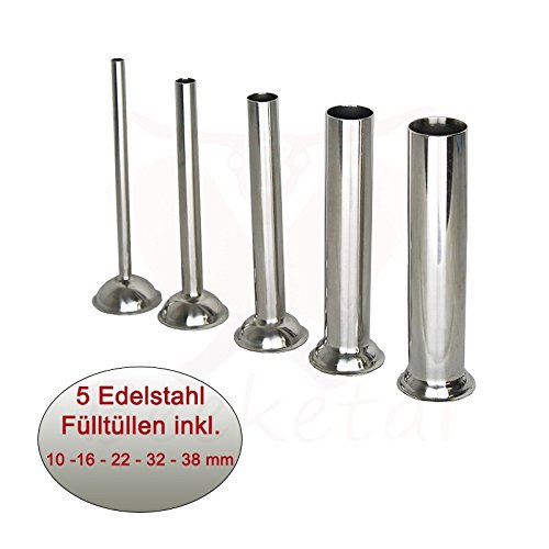 Lieferumfang: Edelstahl Wurstfüllmaschine, 5 x Fülltüllen (10, 16, 22, 32 und 38 mm Ø), Adana Kebap Maker Aufsatz, 3 x Spießeinsätze, 10 Kebap Spieße, inkl. gratis Zubehör: 2 x Ersatzdichtung